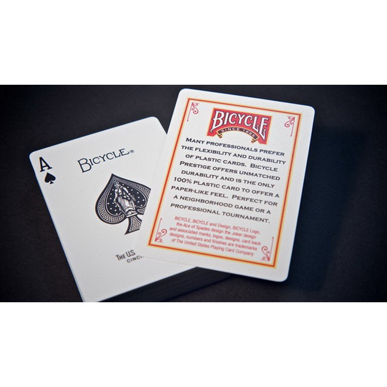 Bicycle magic playing cards is an artistic tribute to every impish trick that has astounded audiences for over 5000 years. Comes in either red or blue backed decks. These bicycle prestige playing cards offers unmatched durability and is the only 100 plastic card to offer a paper like feel.